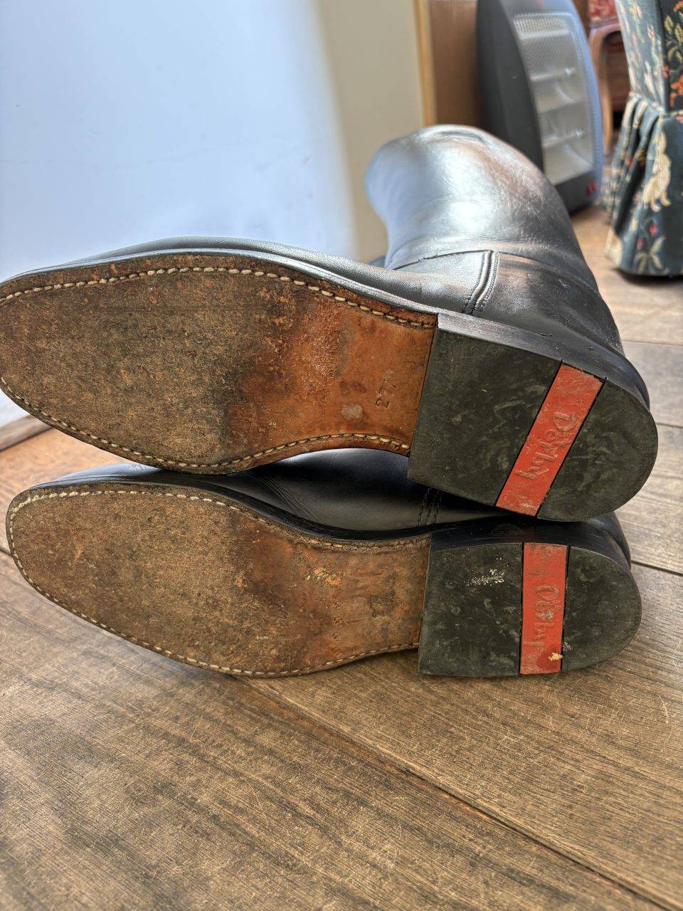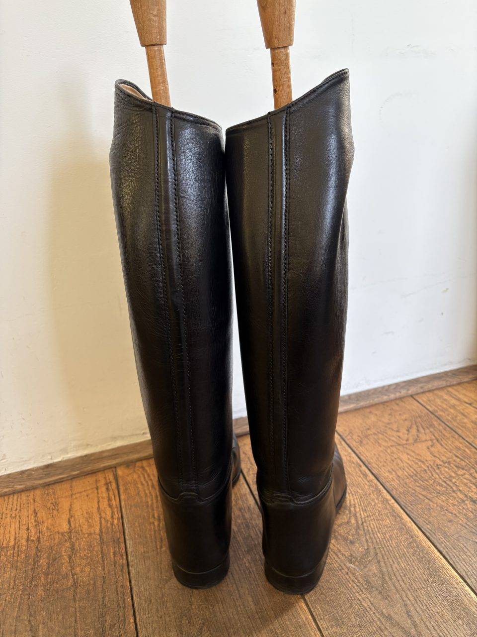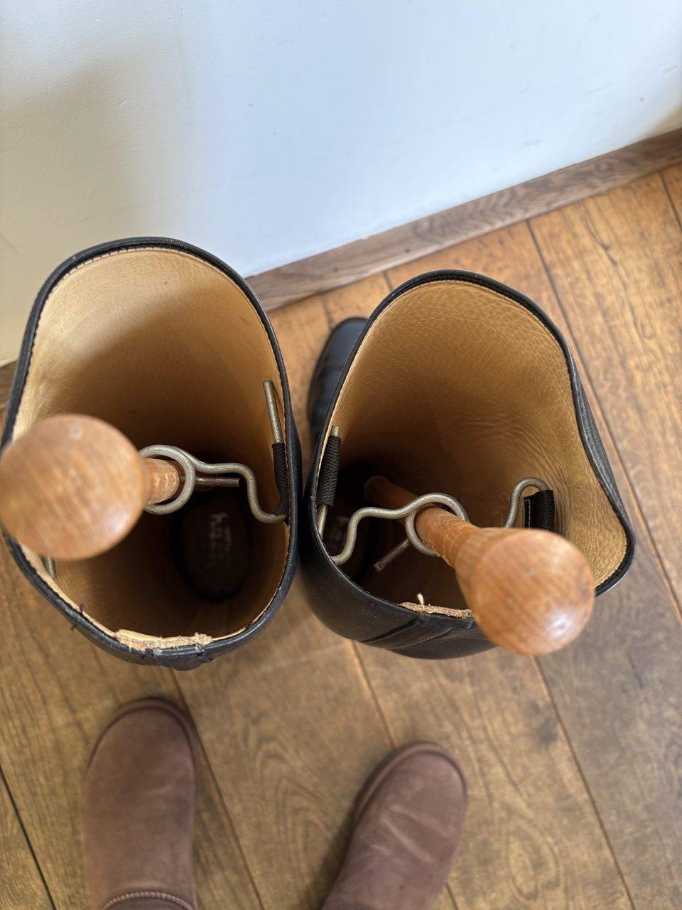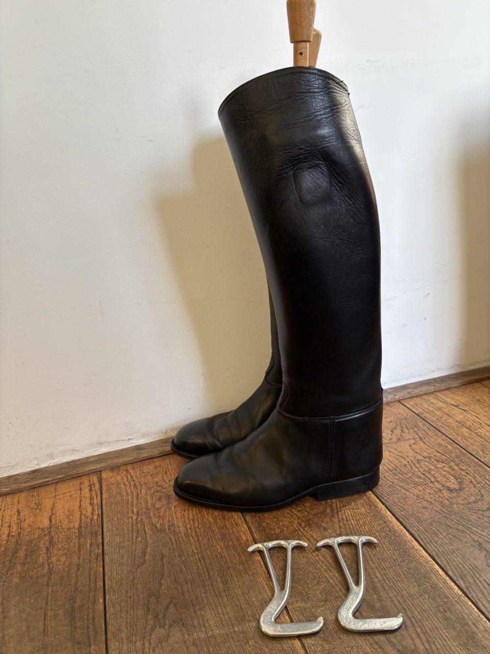 Lederen Derby dressuurlaarzen, heren, maat 44, kuit 39cm, zeer goede staat. Incl laarzentrekkers en spanners